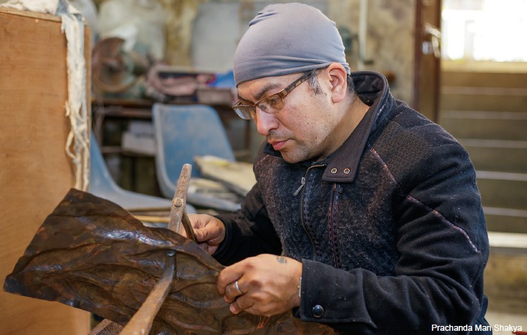 However, when talking about large statues, one cannot top the achievements of Raj Kumar Shakya, another prominent metal sculptor of Okubahal, who recently shifted his workshop to Haatiban because of the damages to his ancestral home by the 2015 quake. He specializes in metal sheet embossing and making large-sized statues, as well as stupas, mandalas, and temples. He, or rather, one of his works, was in the limelight recently—a 155-ft-tall statue of Guru Padmasambhava in the eastern part of Bhutan, which was completed in March 20, 2014. It consists of 40-ft high pedestal, and the face alone is 15 ft in length. A total of 70,000 kg of copper was used in its making. Another of the master’s notable works is a 16-ft Bhumisparsha Buddha in Lumbini, and presently he is busy on another massive work, a 50-ft Siddhartha Buddha that will adorn the Ling Sang Temple, also in Lumbini. Raj Kumar was responsible for all the repousse work done in the Nepal pavilions at the World Expos in Hanover in 2000 and Shanghai in 2010. He is also a recipient of the “Best Artist of the Year” award by FHAN.
