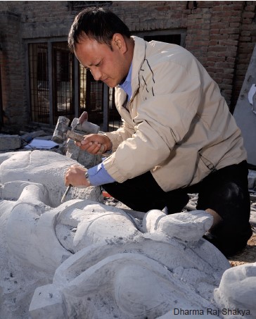 Okubahal is also home to another illustrious metal-sculpting family, that of the legendary Siddhi Raja Shakya, whose sons are now enthusiastically continuing the tradition and upholding the master’s proud legacy. Siddhi Raja’s father, Punya Raja Shakya, was also a sculptor who sculpted impressive statues in copper, brass, silver, gold, pancha dhatu (amalgamation of five metals), and astha dhatu (amalgamation of eight metals). The statues they make are of Buddha and his incarnations, along with other Buddhist deities, and they are made exclusively for monasteries all over the country and abroad. It is interesting to note that they are descendants of royal monks who were in charge of Rudravarna Mahavihar, the most important monastery in the area (that’s the reason for the honorific ‘Raja’ in their name). Siddhi Raja made twenty-one Bhagwati statues to adorn Hanumandhoka, and two lions for the erstwhile Narayanhiti royal palace, along with a Mayadevi and Chintamani Lokeswar statue. Although their statues are generally 14 to 18 inches tall, some really large ones have also been made, one of the largest being a six-and-half feet statue of Shakyamuni for a monastery in Lumbini.