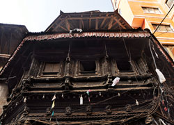 Standing silently among other traditional homes, the walls of the house have beautiful carvings depicting soldiers going to war. Hence, the name Paltan Ghar (paltan meaning ‘band of troops’). Owned by the Basnyat family, Paltan Ghar was built by commander-in-chief Abhiman Singh Basnyat after the unification of Nepal sometime before 1832 B.S.. Before the unification, during the reign of King Jaya Prakash Malla, the land belonged to a Brahmin named Bhajudev. The property was then gifted to Basnyat who commissioned the carvings of 72 soldiers into the walls. This was a way, on Basnyat’s part, of paying homage to the warriors who helped in the unification of Nepal, and Kathmandu Valley in particular. According to Basu Krishna Baidya, whose inherited ayurvedic shop is almost as old as the structure itself, there were seven chowks inside the building. But, as parts of the property were sold over the years, only three remain. Today, although private, the house is not allowed to be sold owing to its historical importance.