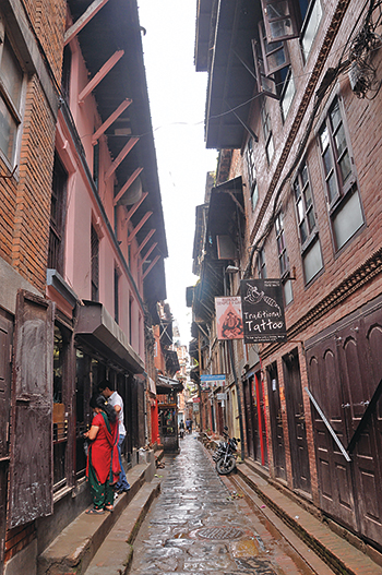 Mo: Madu Galli is the small alley right behind the Krishna Mandir, in between two popular tourist hotspots – D Square Café and Third World Restaurant. It is the galli with the famous sweet shop – Nanda Mithai Bhandar. The name of the galli, according to cultural historian Dilendra Raj Shrestha, is derived from Chinnamasta Temple, also located there. Mo: in Nepal Bhasha means head and Madu means absent. Chinnamasta Goddess is a rup of bhawani without head. The temple also has a tantric mural depicted in its wall.