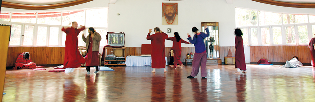 I started the journey early morning on Friday. It was six o’clock in the morning when we reached there. The center is located in the hills of Nagarjun, in a serene setting encircled by green lush trees. As I was walking down the stairs for checking in, my first sight was of a dozen of men and women in saffron gowns dancing to soothing music in a large room with wide glass windows marked as a meditation room.