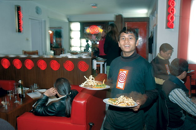 catching up with the red swirl on a board placed just outside the Standard Chartered Bank, along the road that leads to Lagankhel. The swirl (which resembles the ubiquitous symbol of Manokranti painted on walls all around the valley) is the logo of a recently opened restaurant called ‘Red Dingo’. It’s down the alley behind the bank.