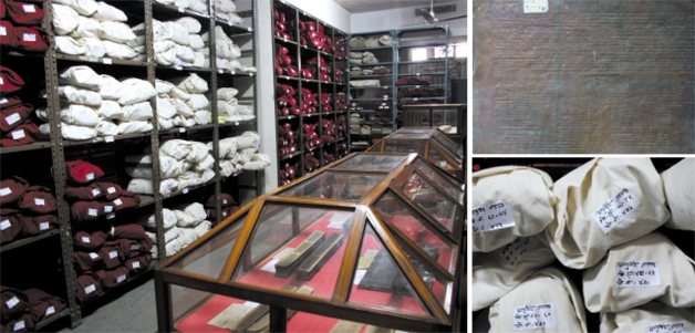The Archival Section possesses varieties of documents collected from government offices like the Shaya Mohar, Lal Mohor, Khadganisan, Sanad, Sawals, Chitthipatras, Sandhipatras, Ek-chappes, Dwi-chappes, Kukkas, Eshitihars and so on. A huge collection of copper plates, rubbings of the stone inscriptions, records of the Government civil servants, government publications and newspapers are also in its custody.