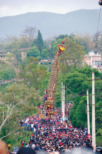 The Jatra had kicked off with much enthusiasm on 22 April, people pulled on the ropes with much gusto. There were people who came down to Bungmati to just have one glimpse of the Red God residing in the 32-foot chariot. The red ribbon tied to the gajur of the chariot wavered to the wind while people rejoiced and shouted in frenzied excitement. Woman danced to the beat of the Nya khin: baja and up on the terrace people wallowed in the celebration of the jatra. But after that fateful Saturday, everything fell silent.