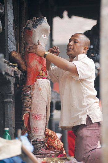 Bandu Dutta Acharya then asked the serpent King Karkotak Maharaj who had previously sneaked inside the stomach of the Yaksha according to their wired plan to impress the Yaksha (who otherwise wouldn’t have let them enter the palace) to come out. Pleased with the medication that was hoaxed, the Yaksha promised to give them anything that they wished for. King Narendra Dev, Bandu Dutta Acharya and the Lalit farmer together reply, “We would want to take your son to Kathmandu Valley.” The three sowers were desperate to get rid of the despair Kathmandu was facing due to the drought Gorakhnatha caused. The prophecy predicted that if Gorakhnatha would meet his teacher Karunamaya, he would free the serpents he sat above and bring rain and rice back to Kathmandu.