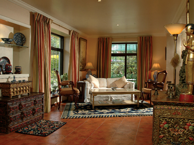 Every collector has a weakness, and Muni’s is for the glazed texture of blue porcelain. The most visible theme in the living room is porcelain. The various pieces of China in many shapes and sizes, may it be a vase, a decorative plate or a table lamp sitting on the side of each corner of the sofa, the idea here is definitely blue. As the Vriesea blooms over the intricately carved Chinese chest, it almost seems to be competing with the luminous glaze of the ceramic. Even the Tibetan carpets are blue with some white. Some of the floor carpets are old saddle carpets with intricate details. Every nook and cranny has been decorated: whether it is the beautifully painted ceramic dining table stand with a glass top, acquired from a retiring ambassador, or the intricately worked Rajasthani tapestries or the series of Chinese silk works on the wall. The art feast continues with various impressionists’ works of flowers and gardens all beautifully framed in “Kalinta”.