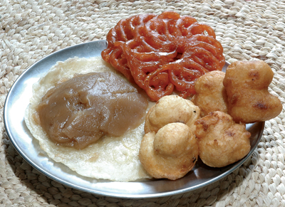 The dishes that we prepare for each meal or feast follow the natural cycles. Normally while 5-6 dishes make up a meal, feasts (bhoj) consist of at least 16 items, cooked and served in a fixed sequence. Alcohol, yogurt and sweets are served not only in fixed quantities but also keeping in mind the human body and its ability to digest. On the special occasion when new sons-in-law are being welcomed home for the first time, 84 dishes (chaurasi benjan) are prepared.