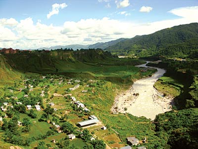 The Seti that disappears into a rocky cleft at the K.I. Singh Bridge exits here at the base of a hill into an almost 400m wide canyon.  More than 100m high embankments tower over the river.  From the ridge, you can see way down a rivulet, Kali, which joins Seti at the foot of a hill as the towering Kahun Danda(hill) soars into the eastern skies.  On the other side of the ridge across a suspension bridge, you can make out a cluster of buildings: the Manipal Hospital.