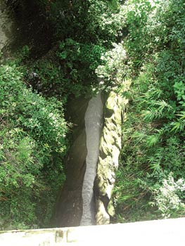 You can peer down from the bridge on both sides for a giddying view. With overhanging brush, the steep side walls slide down some 40m into a gully of rushing water that looks like milk being churned to make butter. Incredulous, you can’t help wondering how come the river so big and wide only a few hundred meters north could squeeze through that crack a little over a meter wide—and disappear into the hills.