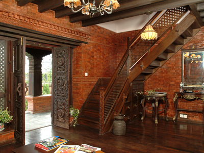 Another interesting feature worth a mention is the innovative fusion of modern and traditional construction methods. The house built with dual structural system; a structural frame with concrete column and beams, wrapped with thick load bearing walls, made with mud mortar like in olden times, is designed to test the time. As the concrete loses its strength, the lime-mortar construction will gain and replace it, keeping the house standing for a longer period. Climatically too, the mud mortar construction naturally keeps the house cool in summer and retains the heat in winter. It seems, no effort was spared for the construction of the house, as the best hands were hired to do the detailing. The construction was meticulously done by local craftsmen from Bhaktapur who were given specific instructions not to spare in quality. The woodwork alone shows the results.