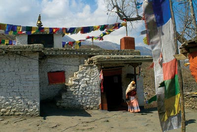 When one begins ascending from Kagbeni to Muktinath Temple in the village of Rani Puwan, travelling along 17Km of sloping road—carrying you a kilometer upwards in altitude to 3,700m—the whole area surrounding you turns into a barren desert of grays, reds, yellows and purples. Again that feeling of changing country takes over until finally you reach the top and grasp its dominating views in all directions upon mountain ranges like Dhaulagiri and Nilgiri.