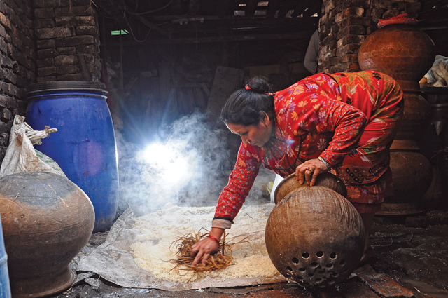 Dor Bahadur Bishta posited that it must be because a group of people in preferred the slow-moving sort of cattle that they got around to fermenting food, while another group preferred the fast-moving sort, and came to abhorring fermentation. Take the ethnic groups from the hills and mountains: they raised pig and chicken, difficult to march over a day’s walk, and they also fermented roots and leaves and beans and grains. Fermentation helped preserve calories and store them conveniently, while also making it possible to, well, get drunk and very happy. That is why a Tamang herdsman above Syafru will have grown a faint yellow line of moustache by eleven in the morning, and that is why old men sit on the bench outside the Patan Museum and watch the endless parade of people that pass. That is what makes people open their hearts to strangers, to scold them and call them closer to the fire, and give them a brimming dabaka of thick, nourishing jaand. It has always brought people together more than it has led to rifts.