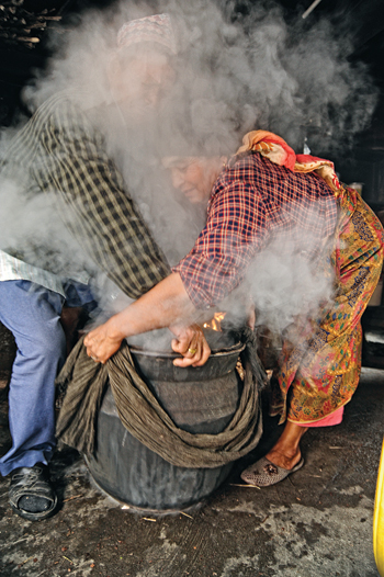 One of the fondest taste of raksi I’ve been privileged to remember was from a Tamang woman in a village above Kapan. It was the day of Shiva Ratri, and a couple of friends had decided to walk through the national park for a day hike. It started drizzling. A wisp of smoke and the smell of fermented wheat lifted skywards from behind a house. I took my friends to the fire. To have the drizzle settle on your face and hair and to dry by a fire where raksi was brewing! The lady tending to the brew took heart at our simple joy and scooped up fresh, warm raksi right from the receptacle. It was also the taste of gratitude that I remember, and the laughter afterward.
