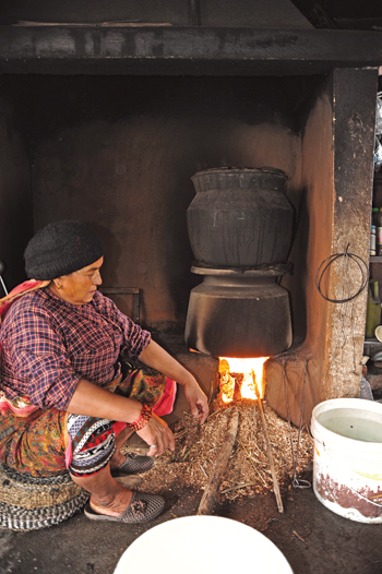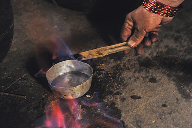 With a piglet in a cane cage and two roosters under the arms of elders, we climbed past the thin mist and into the bright sun on a mountainside. We walked for four hours, not a drop of water or crumb of food in our mouth, until the mere act of stopping for breath made the mouth water and chase away thirst. After another hour of preparing and finishing a puja to the mother goddess who protected those of us living in the valley, we walked to a stream that gurgled out of sleek rocks and put lips to water. It was cold water, cold and sweet, cold and fragrant with the smell of earth and fern roots. Thus quenched, we returned to the shrine where the elders had doled out small quantities of raksi in bohotas, leaf-bowls. The fatigue and hunger sent the alcohol rushing to the brain. Below us, the valley was splendidly lit by the noon-time sun. I remember turning with reverence to the goddess, wondering why she would show the kindness of protecting us, mere mortals made of dust. Grandfather poured a measure of raksi over a stone by the goddess’ shrine. My mouth watered again.
