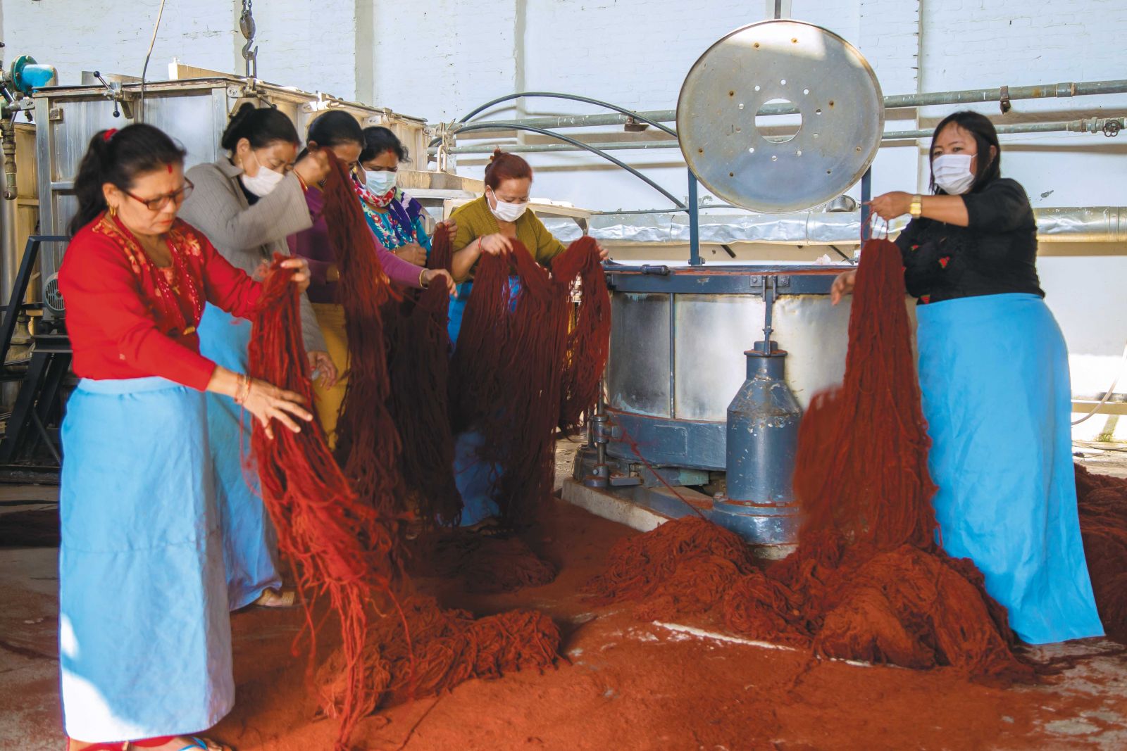 Nepali-Tibetan carpet making begins, as it must, with the sourcing of raw materials. Tibetan Highland Sheep’s wool has been the preferred material of choice for the industry but other wools, such as that from New Zealand as well as a variety of natural fibres such as silk, nettle, aloe, and hemp, to name but a few, can also be used. These fibres can be processed entirely by hand, as has traditionally been the case, and also by machine which has gained prominence more recently. Once processed into finished yarns the materials then visit the dyemaster who transforms them from their natural color into a wide spectrum of hues tailored to the desires of carpet consumers. Once dried thoroughly in the golden Nepali sun the dyed yarns await the weaver who will handknot the design into a carpet.