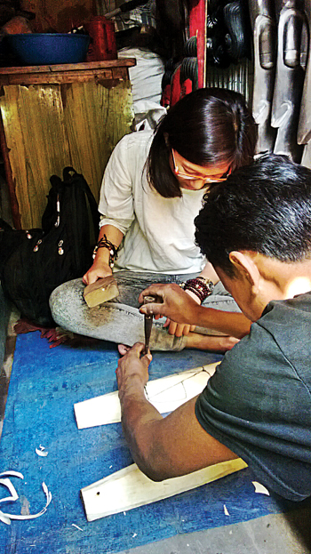 Dhanuki then showed me how to angle the chisel to produce a specific cut, and proceeded to guide my nervous hands to produce actual cuts on the wood. “I’m going to ruin this piece of wood,” I thought, as I hammered it weakly. But the craftsman kept encouraging me, nodding with approval every time I stuck the chisel into the wood and hammered the mallet with brute force. I soon got really into it and my excitement level increased.