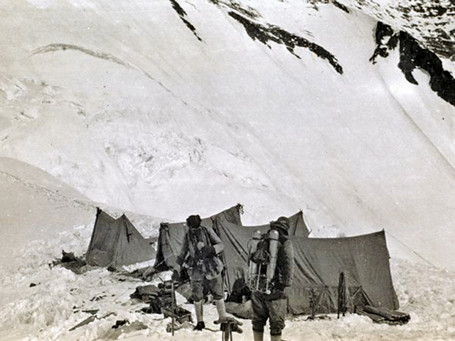 June 6, 1924. In the morning, Mallory and Irvine bid goodbye to Noel Odell, before ascending from Camp 4 at North Col. Odell takes their picture. This becomes the final picture of Mallory
