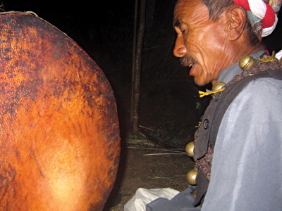 My proper initiation took place on the following night. I drummed for a long time with the assistant while Tej Bahadur summoned Maphung and poured water and rice grains over my head. I drummed until my arm and my crossed legs ached. We paused eventually and I was told that Maphung had failed to enter my body, perhaps, speculated Tej Bahadur, because I ate pork. Tej Bahadur added that he had noticed my legs trembling very slightly. I started the second session a little nervously since I was not sure I would be capable of drumming for its entirety. After about fifteen minutes, something very unexpected happened. My crossed legs began to tremble uncontrollably, at times causing my whole body to bounce up and down. I found it hard to continue beating the dyangro. Tej Bahadur and his assistant intensified their chanting and poured water over my head in an excited frenzy. It was a very intense experience. In the following session, my legs trembled in the same manner, perhaps with even more intensity.
