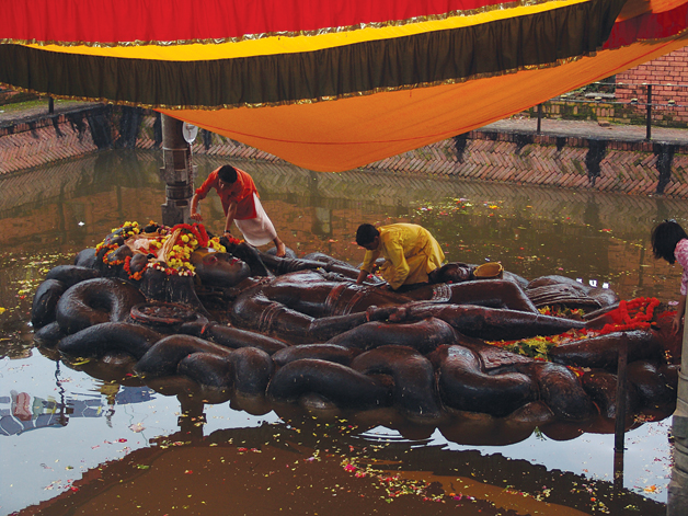 Other significant stone monuments are to be found in the Kathmandu Durbar Square. Kaal Bhairav and a large stone Garuda stand out in the Kathmandu Durbar Square. A huge stone image of Kaal Bhairav representing Lord Shiva in his destructive manifestation occupies a significant portion of the square. The facial expression is terrifying and symbolizes death and destruction. The image is carved from a single stone. The structure was recently restored to its original glory by removing all the concrete additions. Such large images made of a single block of stone are a rarity in Nepal. ‘Budhanilkantha’, nine kilometers north of the city center, is the largest stone sculpture in the Kathmandu valley. The five meter statue of Vishnu lying on a giant nag was carved out of granite, and is known as the ‘Sleeping Vishnu.’