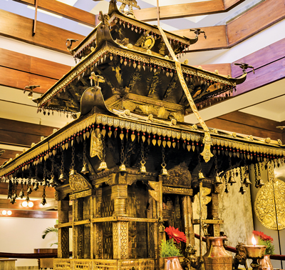 Located near the famous Boudhnath Stupa, a world heritage site monument zone of Kathmandu, Hyatt Regency is set on 37 acres of meticulously landscaped grounds. The architecture of the hotel has been based on traditional Nepali architecture, with its vast lobby embellished with large stone chaityas (stupas) and dhunga dharas (stone spouts) that immediately gives visitors the feeling of Nepal. The hotel has 280 rooms and suites, which include eight suites and seven S-Deluxe, 192 Standard, 38 Stupa View, and 35 Regency Club rooms. Doubtless, one can assume that the Stupa View rooms are much in demand.