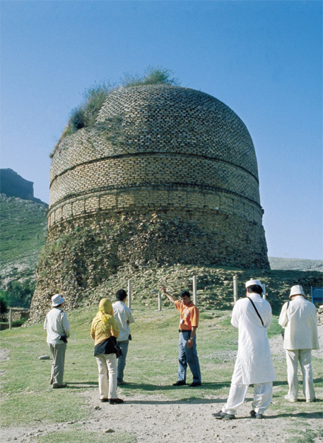 After lunch we got off the bus and climbed up countless steps under the scorching April sun to reach one of the most beautiful sites, Takht-i-Bahi in Mardan District (54 km. from Peshawar). Dating back to the 2nd-5th Cent CE, this has been declared a UNESCO World Heritage Site (see pg.48) . Although a ruin, much can be made out of its architectural splendor. With the guidance of Professor Sehrai, we could discern a court of mini stupas, monastery, assembly hall and dark and cool underground chambers. He went on to explain, “These monasteries were built on hills away from farmland and the sites were always well chosen. The monks held fortnightly as well as emergency meetings here, and people of other religions were also allowed to attend the discourses. Their downfall came when the funds that they received from patrons dried up. The monks then slowly came down from the monastery and mingled with the general public.”