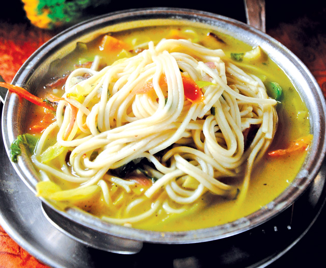 Out on the Dhobighat side of Ring Road, in the most unlikely location, is a shiny blue building where you will find the best udon in Nepal. Handmade by a Japanese man and his well-trained staff, the noodles are just as they should be: thick, chewy, and hearty. You can choose from many variants—tofu, vegetables, or meat. The Chicken Curry Udon is just awesome, as are any of the hot pot choices. They have soba, too.