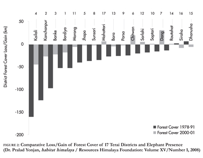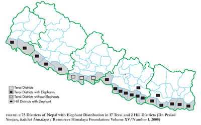 Of about 25% of Nepal’s total land area, or close to 36,360 km2 of forest cover (FAO figures), approximately 2,500 km2 of forest in the narrow lowland Terai belt, with 17 Terai and 2 Hill districts, are inhabited by wild elephants. Out of this, 1,600 km2 are under protected area management in the form of national parks and reserve forests, namely: a) Shuklaphanta Wildlife Reserve, 2) Bardia National Park, 3) Chitwan National Park, 4) Parsa Wildlife Reserve, and 4) Koshi Tappu Wildlife Reserve.