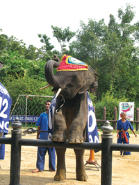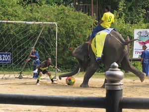 P laying soccer: An elephant positions the ball before attempting to shoot it past the goalkeeper