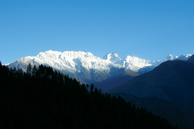 Each day we saw red and white rhododendron flowers along the trail against the clear blue sky. It did rain and it did snow, but it cleared up quickly to give us spectacular views of the flora and landscape of the area. Red, white and blue are the colors that make up the Nepali national flag and it is Nepal Tourism year. We all carried the flag, sticking out of each of our backpacks as we climbed up and walked down the slopes of the Himalayas. Recently there has been some debate as to whether we should change the flag. As you walk through Langtang, the blue becomes the sky and the numerous rivers, the white becomes the purity of the glaciers and the rhododendron, the red is the rhododendron and the blood of the entrepreneurial spirit of the people; and as long as the sun and moon comes up each day over the ridge to the east, this country will be there. The first night of our trek, we were greeted by a full moon. Red, blue and white also make up the flag of the USA whose 60 years in Nepal we were celebrating.