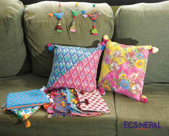 One of the brands featured here is Muskan—Bringing Back Smiles, which specializes in hand stitched products. The smile (muskan) of a woman is priceless, and this smile means so much when the very basic idea of personal choice and economic freedom is a far-fetched dream for most Nepali women. Muskan approaches women groups in bahals, and provides them with trainings for sewing and knitting. They then join hands with them to engage them in producing a range of hand stitched products —cushion covers, tote bags, pouches, cotton dresses, pompoms and earrings.