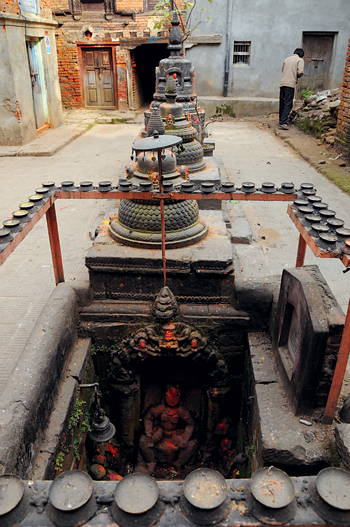 In this second square, woodcarvers ply their craft in the sun, seated on the ground by a sunken shrine surrounded by candleholders. The shrine is four feet below the courtyard and houses a weathered goddess. An old plaque in Nepali gives a recent date; but that refers to the surrounding framework created by a reverential patron.