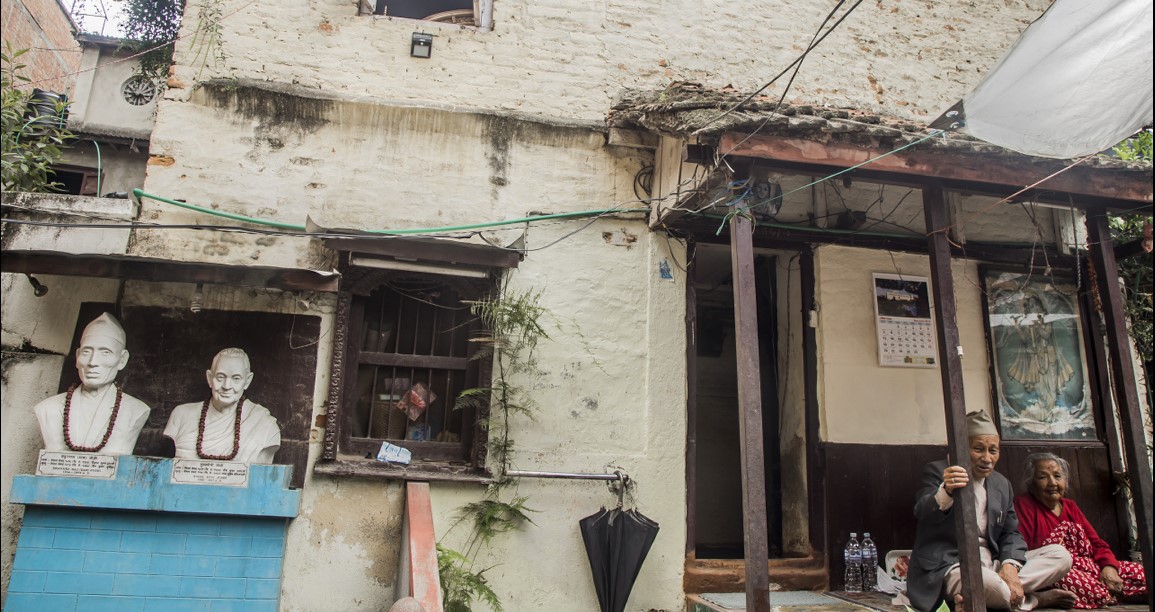 Her husband came out dressed in a dark grey dauara suruwal and coat. He had his familiar black Nepali topi on his head, and also had put on a small red tika on his wide forehead. We went into the new construction besides the house. “This was handed over yesterday,” he said. “It was built by an organization called The Art Village.” The large room had a double bed (presumably to take a rest during the day), a couple of sofa sets, and a long L-shaped cabinet along one wall, on which sat the old tape record-cum-radio, a dozen literary books, half a dozen or so framed awards, and two busts of the centenarian, one golden, the other bronzed.