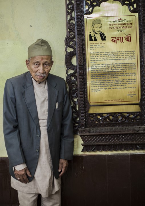 Having absorbed as much as I could, I got on my bike and roared off, but right round the first corner of the narrow alley, I stopped. A bookshop displayed the latest issue of ECS Nepal, along with other periodicals. I requested the lady minding the shop if I could take it to present it to Satya Mohan Joshi. I explained about our plans. She was very happy, I could see, on hearing what I had to say, and willingly gave me the magazine. Not only that, she even began eulogizing about her esteemed neighbor to me. “He may be one hundred years, but he is still very sharp,” she said with a smile. “He often comes here to pick up newspapers and magazines, and although he now has a guard provided by the municipality, he insists on coming himself, saying, ‘I don’t want to bother anybody.’”