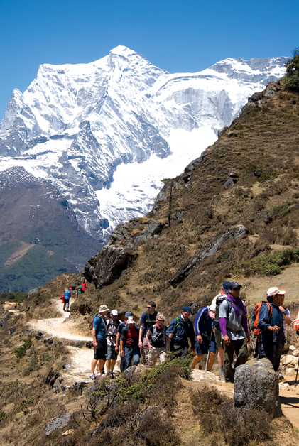 question on the mind of anyone planning to go trekking in this Himalayan country, home to eight of the world’s 14 peaks over 8,000 m. Dr. Stephen Bezruchka, a medical doctor and a frequent, long time visitor to Nepal has written a book called ‘Trekking in Nepal’. In his book, he states that a trekker in the hills around Pokhara, on waking up early and directing his/her gaze to the north, can see the triangular rock and snow face of Machhapuchhare (the fi shtail mountain) glistening in the sun through a hole in the clouds. Or you may meet a retired soldier in a remote village who speaks fl awless English. Trekking in Nepal took off in the late 60s and early 70s. A trek is basically a trip back in time for people from a competitive and technologically driven modern society. During a trek, life goes on in its slow, unhurried way; human interactions take place face-to-face over a cup of hot chiya (tea); and people enjoy doing one thing at a time.