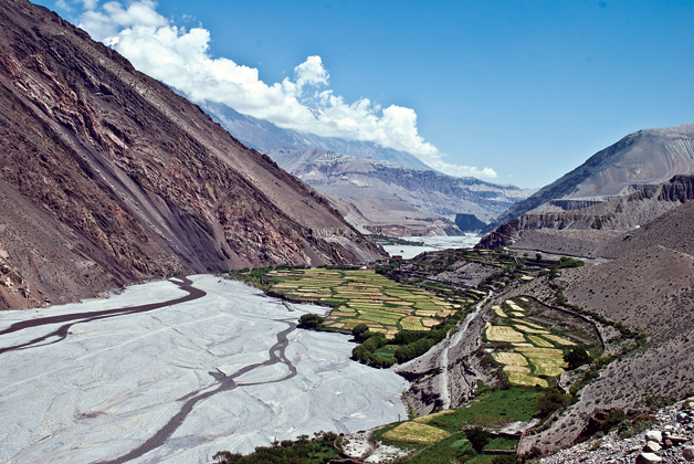 (hot water), famous for its hot springs and delightful lodges with an abundance of fresh fruits and vegetables. The trail then climbs steeply to eventually reach the villages of Lete and Kalopani. These villages have delightful lodges and a superb mountain panorama with views of both the Dhaulagiri and Annapurna Himals. The villages of Kobang and Larjung offer stupendous foreshortened views of the Dhaulagiri massif. Due to the greater heating of the air above the Tibetan plateau, a fierce wind roars along the valley every afternoon. Houses in this region have small windows and huddle behind rocks and other features as protection against the fierce wind.