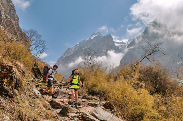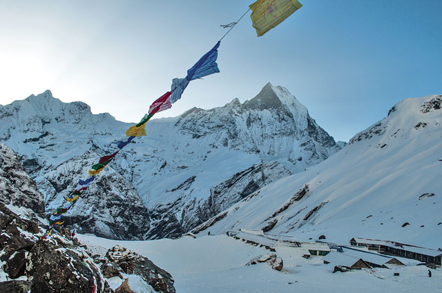 3. Make your way to one of the chortens at ABC to watch the breathtaking sunrise that sometimes seems so preternatural that you have to pinch yourself more than once. Enjoy the panoramic view and the glaciers while you are up on the cliff where the chorten are. These chortens, decked with prayer flags, send messages to the gods from the departed souls of mountaineers. They serve as a reminder about the fragility of human lives on the majestic mountains.