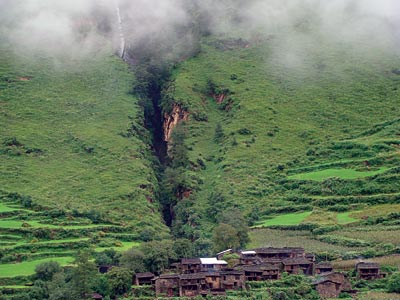 In the evening we descended into Prok. Corn cultivation had turned the landscape green. Dark houses stood besideand behind the corn fields, appearing like they were some sort of plant. A monastery stood on a heavily eroded bluffto the village’s north. It gave the impression of resignation; an overnight shower would have washed it away. It stood not just as a symbol of faith and piety but as a reminder of impermanence, which was specially heightened in the monsoon. We passed under stone gateways, from the top of which deities etched on slabs of stonescast their benevolent gaze upon those entering the village.