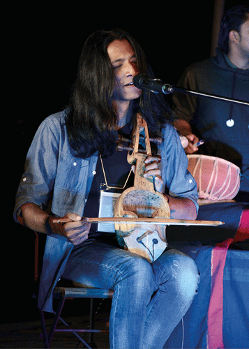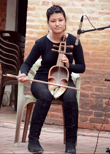 Project Tungna had an endearing ensemble of father and son with their friends. The tungnas were handmade by the father. One of the tungnas was colorful and had carvings of a dragon’s head. He explained how the colors and other embellishments in his tungna had astrological significance. Tungna is used for the rhythm (sur) and dhamfu for beats (taal). It is primarily played by Tamang and Sherpa communities in the upper hilly and Himalayan regions. They played mangal dhun beautifully, followed by other festive tunes. The band Panchamrit used tabala,along with tungna and sarangi. They had just returned from a tour across Europe. If personalities were assigned to instruments, the tabala would be seen as somewhat shy. It produces subtle beats in the background, but it was certainly spewing magic with soothing and revitalizing scores, as the rain soaked listeners were refusing to leave their seats. The tabala proved itself to be the backbone of the performance. ATM (Asan Tebahal Maru) Trio also played nyakhein and danga. Danga is almost extinct, with only a handful of players left in the world. Interestingly, this band is the last surviving group to play dapha in the Wura (Buddhist Newars) community.