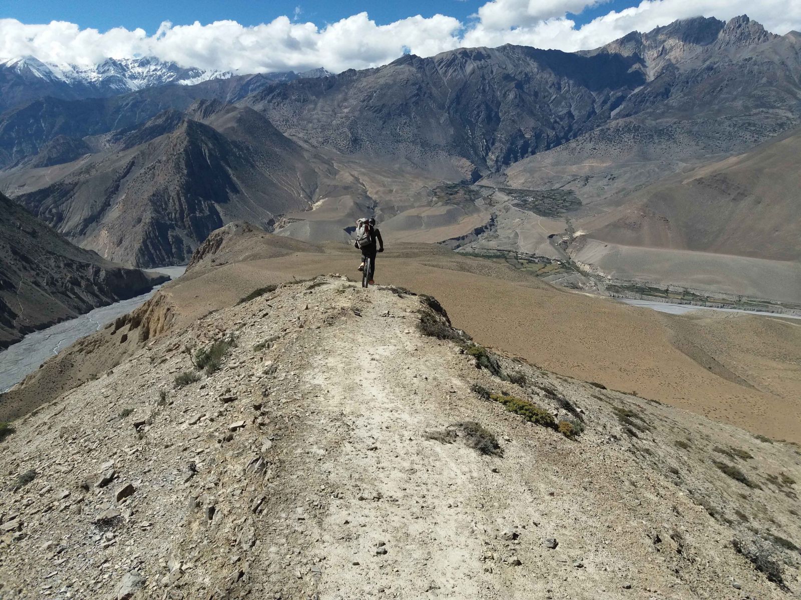 I often bike in the south of Kathmandu, and very much enjoy the ride on the small trails towards the large suspension bridge over the Nakhu River south of Chapagaun. There are also great small single trails in the southern hills of the valley. My favorite one, however, is in the Annapurna area, biking up to Muktinath. The reward for this long uphill is the mythic downhill Lupra free-ride to Eklebati, and from there to Jomson, Dhumba Lake, and Marpha. From all points of these trails, you have ever-changing, majestic up-close views of the Annapurna-Dhaulagiri-Nilgiri range. This experience of a lifetime was so addictive that I repeated it three times!