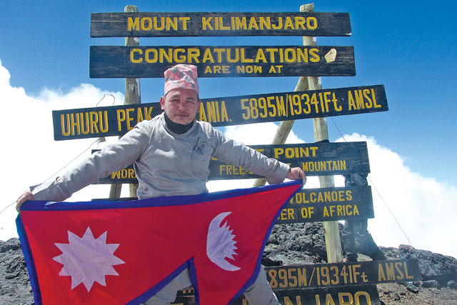 After climbing a few more mountains here and there, he decided to expand his mountaineering career into mountains all over the world, and not just Nepal. In 2014, he went to climb the African mountain Mt. Kilimanjaro, and was the fastest climber. After that,he ascended Europe’s highest-peak, Mt. Elbrus, which he did half-naked in 6 minutes and 30 seconds. After setting an impressive and unique record in Mt. Elbrus, he went to climb the Australian mountain Mt. Kosciuszko backwards. He began his ascent from Threadbo, a small alpine village, and reached the very top in 5 h and 45 min—dressed in the traditional daurasurwaland Dhaka topi.