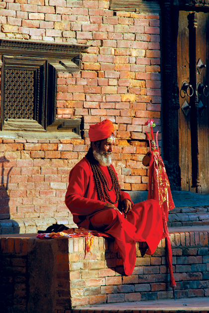 A Shiva Bhakti Sadhu, clad in red, sits at the Patan Durbar Square area.