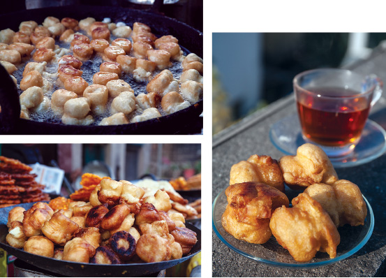 If you’ve not have had enough of breakfast, order alu wo: chopped potatoes, deep-fried, and coated with chick peas. A cup of sweetened milk tea elevates its taste further.