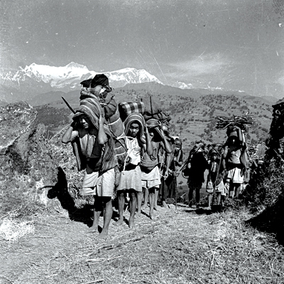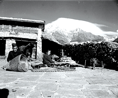 Being one of the first, if not the first, outdoors photographers in Nepal, Shrestha’s photos are a pictorial depiction of the multiple facets of Nepal’s past. Most of his photos depict something that has been lost forever. One photo I particularly liked (possibly one of his most widely seen photos, for thousands of postcards were made from it) is a scene from a village somewhere in the Annapurna region. A Gurung man and woman are working in their courtyard. The man is weaving a basket, the woman a blanket. Behind them a buffalo stands with its eyes closed in apparent bliss. A massive wall of ice and rock looms in the background. It is a simple scene, an image that could have occurred in any village near the mountains. People, animal, objects, and geographical features similar to those in that photo may still be around, but the harmony between them that the photo has captured is rarely seen nowadays.