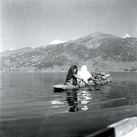 Shrestha traveled to all of Nepal’s 14 administrative zones in search of photos. His photographic journey spans different eras, from black-and-whites to color photos. When I first saw his photos on the computer in the Photo Circle office it felt like watching postcards that had somehow been lost and turned up decades later after being posted. My favorite is his photo of Pokhara’s Phewa Tal. Two girls sitting on a dugout canoe are paddling north. Between them is a bundle of firewood. Machapuchhrey and Annapurna thrust up from behind the hills like white fangs. The girl sitting in the back is looking back at the camera. I felt a sense of dual departure in the photo: The girls were heading home, but along with them time was also moving, pulling that way of life into the future, where it would have no place. Shrestha’s photo allows us a momentary eye contact with the girl, and through her, with the past.