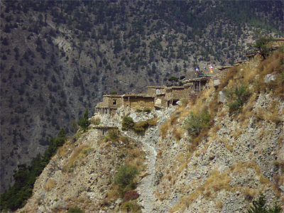 That airport is the only quick way in or out of the region, although the dirt road that carves an ugly if useful scar up the west side of the Annapurna Circuit carries most of the pilgrims and many of the backpackers. In case you’d like to drive it yourself, you can’t. It’s served only by public buses and jeeps that rattle dustily up what the BBC has dubbed one of the “world’s most dangerous roads” -- although this may only be because the BBC hasn’t seen many other roads in Nepal -- until they stop in the same part of Jomsom you’d find if you came by the 20-minute plane. That’s the end of the road. To go further, everyone has to shoulder their packs and file across a footbridge over the Kali Gandaki River to a jeep road that starts at the other, older end of town.