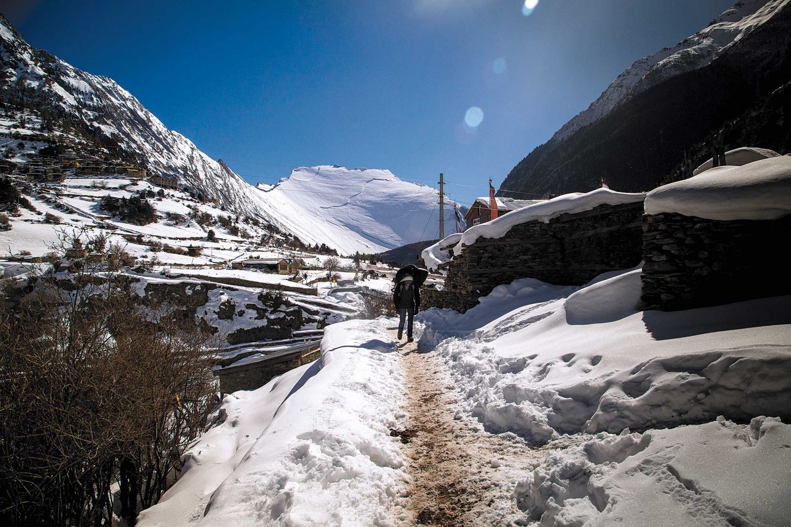Pasang Nuru’s radio crackled sharply. The three of us waiting with him looked up. “We see the ice,” Vinayak radioed. “Left or right?” Left, Vinayak confirmed. Far left and up. Fair enough. From that point on there really was no right way, just the path of least resistance toward the right general direction of the ice flow. We had left the Annapurna Circuit trekking trail behind an hour ago to scramble along wet boulders dotting the river bank. Now, we were carving our own path through hip-deep snow. As we lifted each leg, the snow filled the spaces they left.