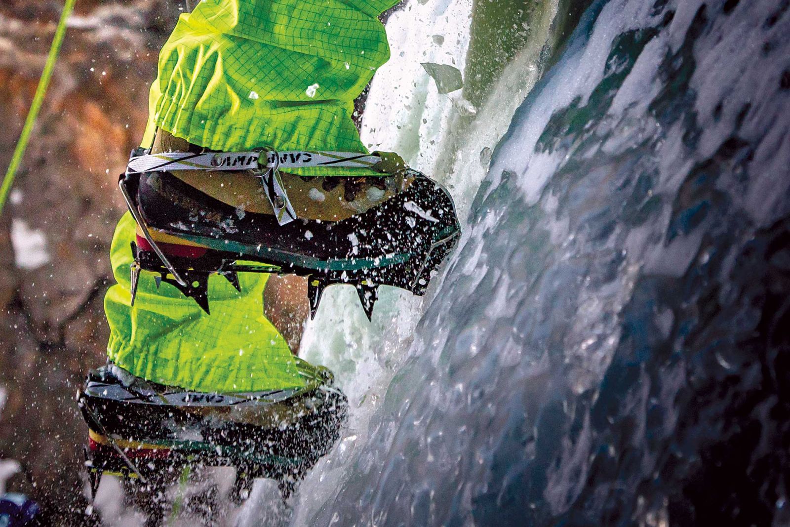The climb started out with big knobs I could practically grab onto with my gloved hands and nice solid sections for the crampons on my feet. Swinging both ice tools into the ice above my head, I could lift my feet one at a time to kick into the ice. With each kick, the two vertical frontpoints of my crampon would crunch into the ice. By dropping my heels just a bit, I could bring the other two points on the front of my crampons into contact with the ice. Standing up on both feet, I could move the tools in my hands upwards once more.