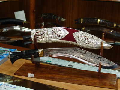 A valued gift one could give would be a khukuri, the world famous Gurkha knife. Mostly made in the Dharan/Dhankuta areas, they come in great varieties. The tiniest ones are those that can be worn on a jacket or as a tiepin. The largest are about a meter in length and can be really heavy. The choices are many: plain or with engravings. They also come in all shapes and sizes. Then there are various kinds of sheaths: black or red, with metal decorations or without. The red ones usually have decorations in silver. The smaller ones are priced at NRs 250/-, while the normal handy khukuris (the size used by Gurkha soldiers) can cost up to NRs 3,500/-. However, if a generous amount of silver has been used in the sheath, it could cost up to NRs 8,500/-. The very large khukuris, up to a meter in length sell for NRs 6000/-.
