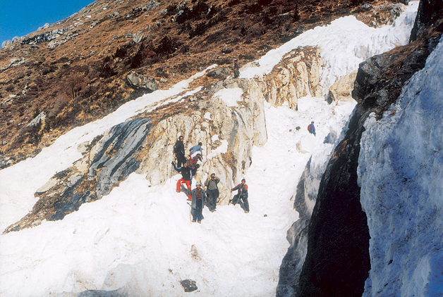 The adverse weather on the fateful day was unexpected. An extreme snow blizzard engulfed Camp II and then Camp I. Not deeming appropriate and safe, Dawa with his friends returned to Base Camp around 3 pm. After melting water, preparing and consuming tea, Dawa felt the need to change his wet clothes before embarking on his next task. While in the process of changing around 4 pm inside the tent, Dawa and his three friends heard an explosion. Intuition told him that it must be an avalanche. In the next moment they found themselves floating on air amidst the snow (inside the tent), released by snow blowing from the windward sides of the ridges to the right, and were pushed approximately 100 m towards the left of the hillock into a crevasse. The French and the Nepalis did not as much realize what had occurred as they were washed southwards by the sheer power of gravity that exceeded the strength of the snow cover.