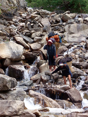 The three routes that make up the Guerrilla Trek diverge at Dhorpatan. The longer routes head north while the shortest route continues west along the Uttar Ganga to Taka and Sera villages. The Uttar Ganga River emerges as a runoff from the southern slopes of Dhaulagiri (8,167 m, 26,749 ft), the world’s seventh highest peak, and its broad range. It drains the Dhorpatan Valley and is a tributary of Rukum’s Sani Bheri River which becomes the Bheri River, itself a branch of the great Karnali River whose waters eventually flow into the mighty mother Ganga (Ganges) of India. The sacred Ganga flows across the plains of north India and empties into the Bay of Bengal near Kolkata (and eventually the cycle is completed as moisture from the Bay of Bengal is brought back to Nepal by monsoon rains).